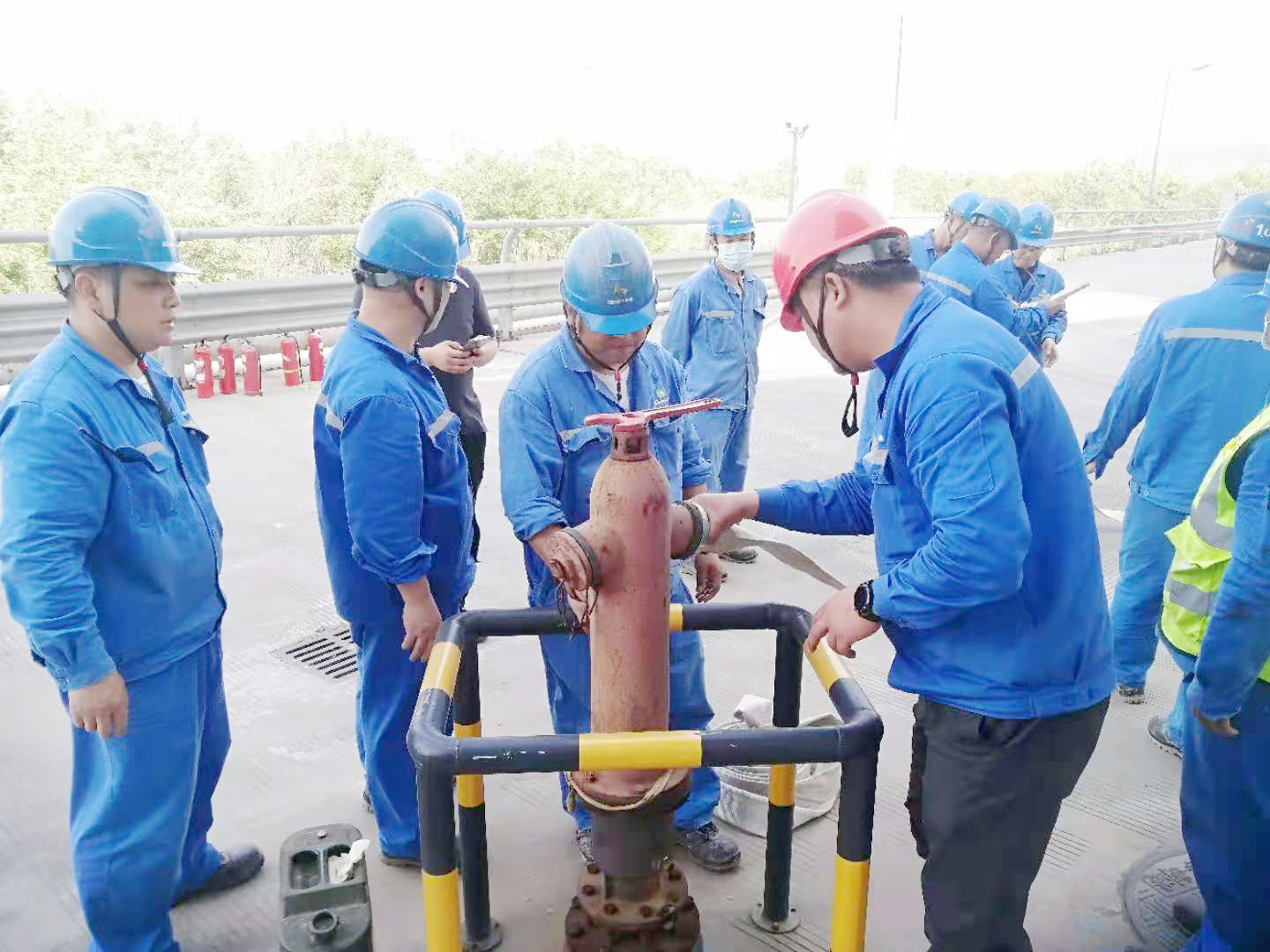 在大家掌握灭火器的使用方法后,徐永康就利用消防水带灭火进行培训讲解,对于使用过程中避免水带扭折和至少要有两人握紧水枪等细节一一作了强调。