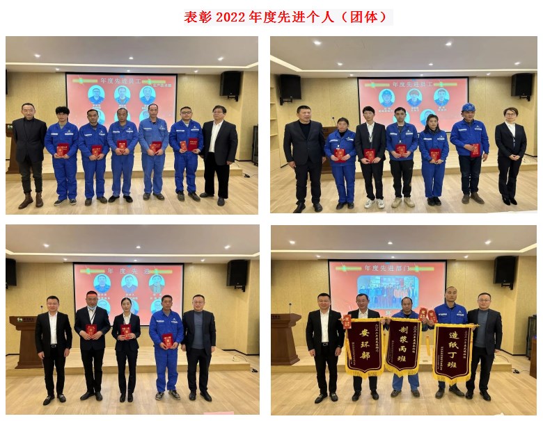 “百舸争流齐奋进,榜样引领勇争先”。2022年度和泓纸业涌现了一批表现优异的先进。会上,由集团总裁林刚、公司总经理应红波等领导为2022年度先进员工、先进管理者、先进部门、先进班组、安全班组、先进党员和先进工会工作者颁发了荣誉证书和奖金,希望受表彰的个人和团体再接再厉、不断进取、再创佳绩,全体员工要以先进为榜样比学赶超、争先创优。