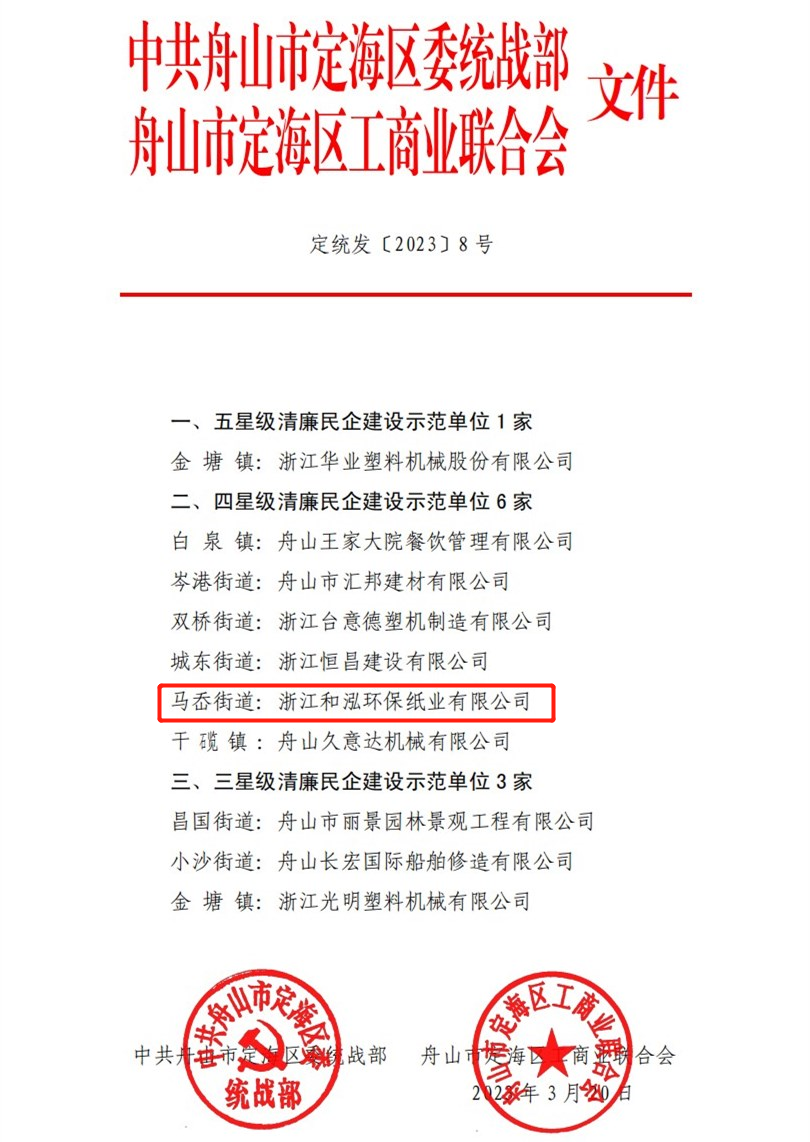 4月3日上午,全市“同心同廉·清廉民企”建设暨助力营商环境优化提升现场推进会在舟山市正山智能制造科技股份有限公司会议室召开,大会对获奖单位进行隆重通报表彰,和泓纸业荣获“舟山市清廉民企建设示范单位”。